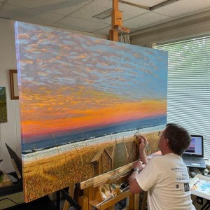 I recently undertook a large piece for an above couch spot in a living room, the painting is 40×60″ What A View. I have a scale drawing that I hung on the wall for size and angle adjustments, two screens- 1 a PC for full image and an Ipad to zoom in for details. My wife, Lisa took a picture of me working on the canvas to help show the scale. And a funny thing I learned along the way is that a big canvas will hurt my knees from pushing off from side to side!